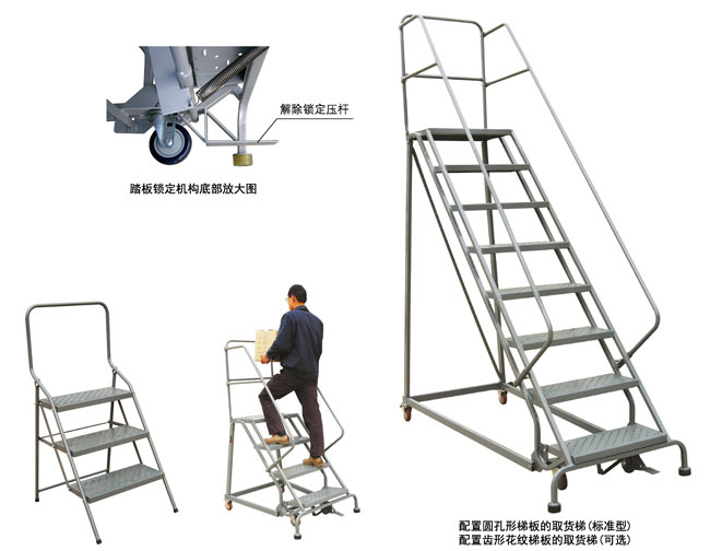 ● 配置踏板鎖定機構(gòu).踩壓底部踏板可自動固定梯子;踩壓底部踏板下方的解除鎖定壓桿,便可輕松移動取貨梯